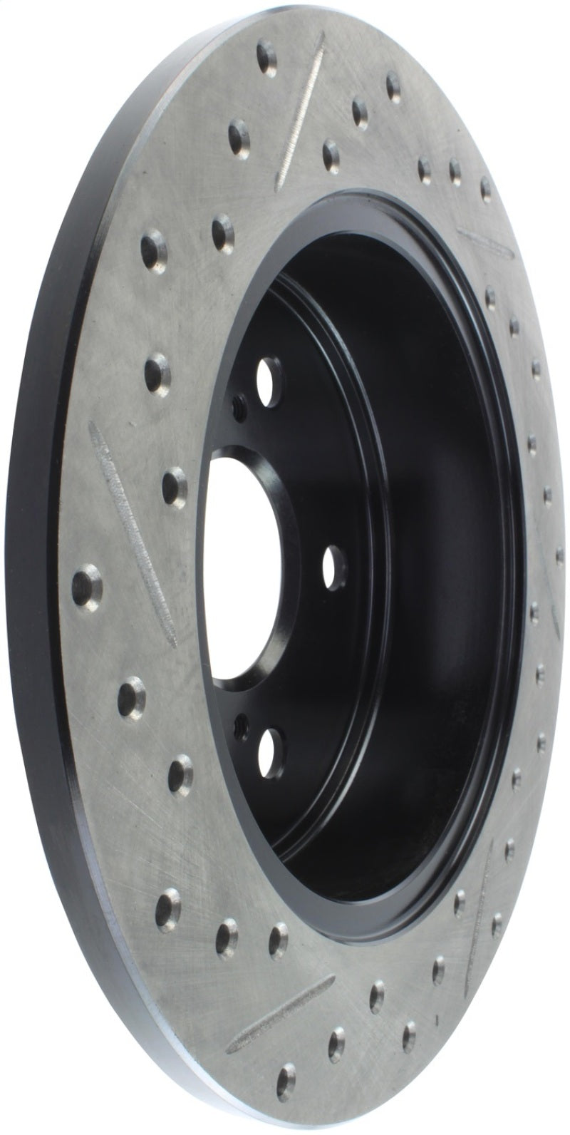 StopTech Drilled and Slotted Sport Rotors are 1-piece direct replacement brake discs for factory brake systems and stock calipers that look great behind your wheels – and offer significantly improved braking performance. The unique cross-drilling and slotting aids with heat and brake dust dispersal, prevents glazing of the pads, adds bite and improves wet and dry braking performance. Built to last, the black e-coating provides protection from corrosion and the high carbon metallurgy (in most applications) offers quieter operation, better crack resistance and increased performance.