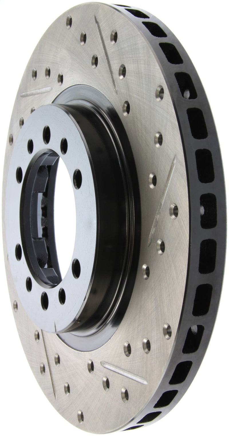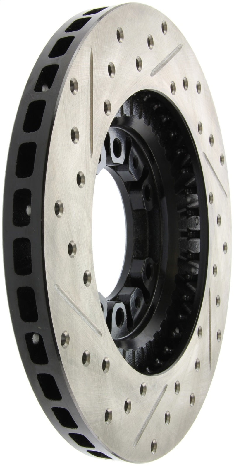 StopTech Drilled and Slotted Sport Rotors are 1-piece direct replacement brake discs for factory brake systems and stock calipers that look great behind your wheels – and offer significantly improved braking performance. The unique cross-drilling and slotting aids with heat and brake dust dispersal, prevents glazing of the pads, adds bite and improves wet and dry braking performance. Built to last, the black e-coating provides protection from corrosion and the high carbon metallurgy (in most applications) offers quieter operation, better crack resistance and increased performance.
