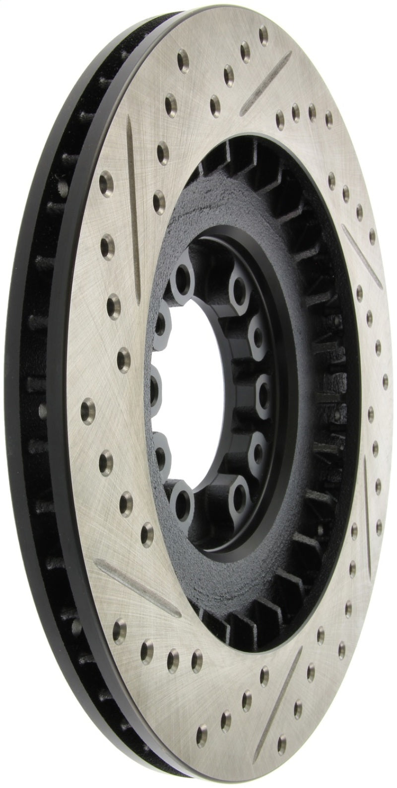 StopTech Drilled and Slotted Sport Rotors are 1-piece direct replacement brake discs for factory brake systems and stock calipers that look great behind your wheels – and offer significantly improved braking performance. The unique cross-drilling and slotting aids with heat and brake dust dispersal, prevents glazing of the pads, adds bite and improves wet and dry braking performance. Built to last, the black e-coating provides protection from corrosion and the high carbon metallurgy (in most applications) offers quieter operation, better crack resistance and increased performance.