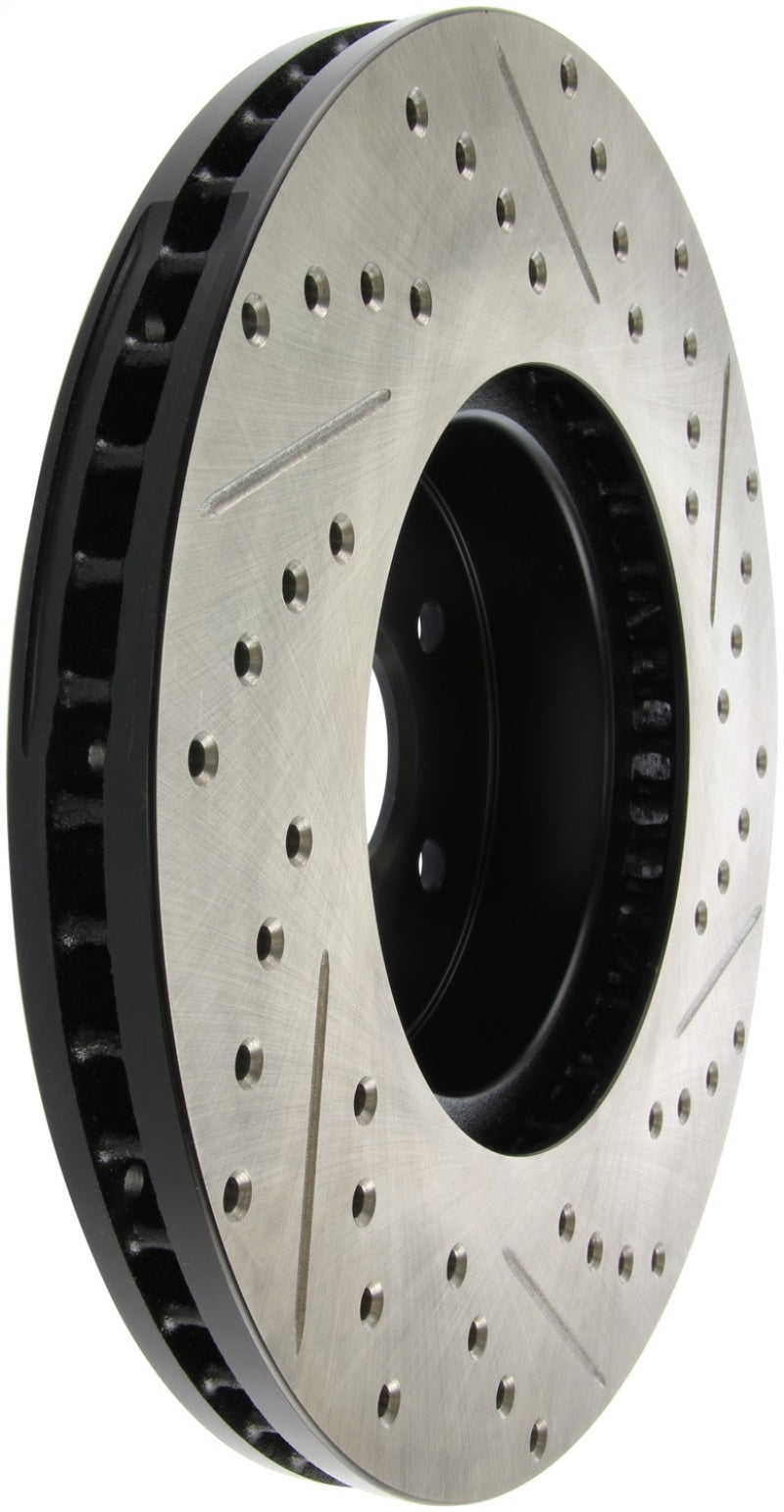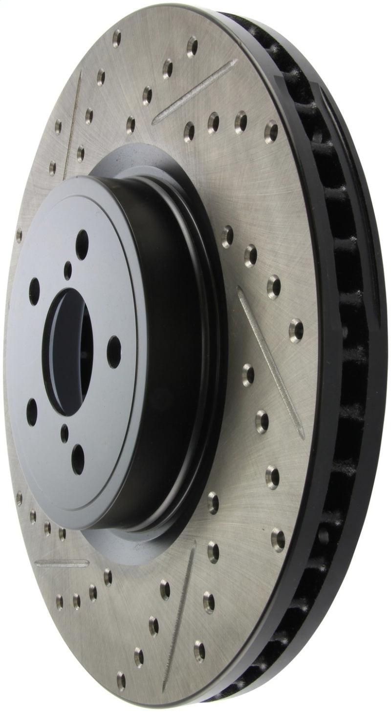StopTech Drilled and Slotted Sport Rotors are 1-piece direct replacement brake discs for factory brake systems and stock calipers that look great behind your wheels – and offer significantly improved braking performance. The unique cross-drilling and slotting aids with heat and brake dust dispersal, prevents glazing of the pads, adds bite and improves wet and dry braking performance. Built to last, the black e-coating provides protection from corrosion and the high carbon metallurgy (in most applications) offers quieter operation, better crack resistance and increased performance.
