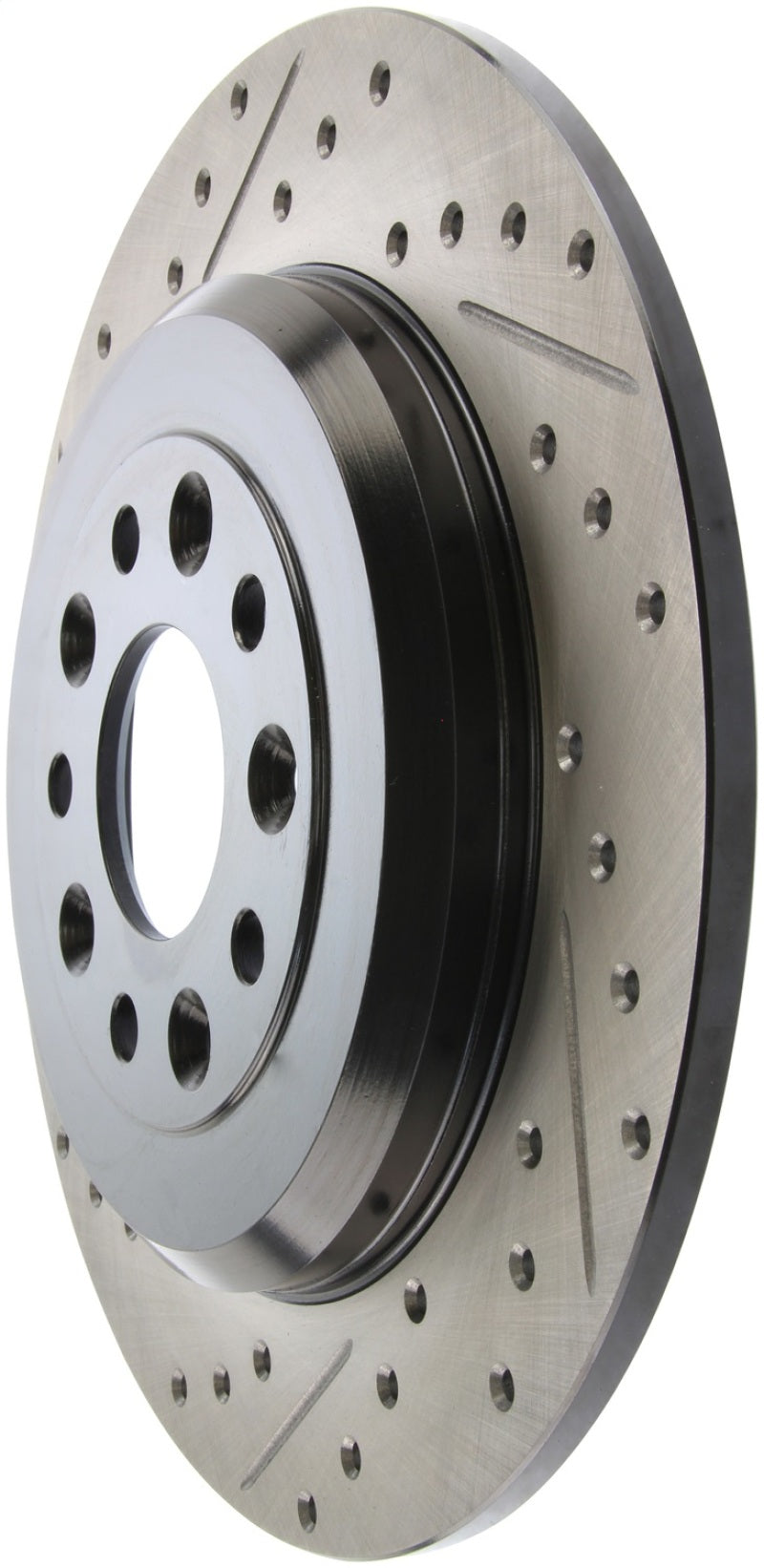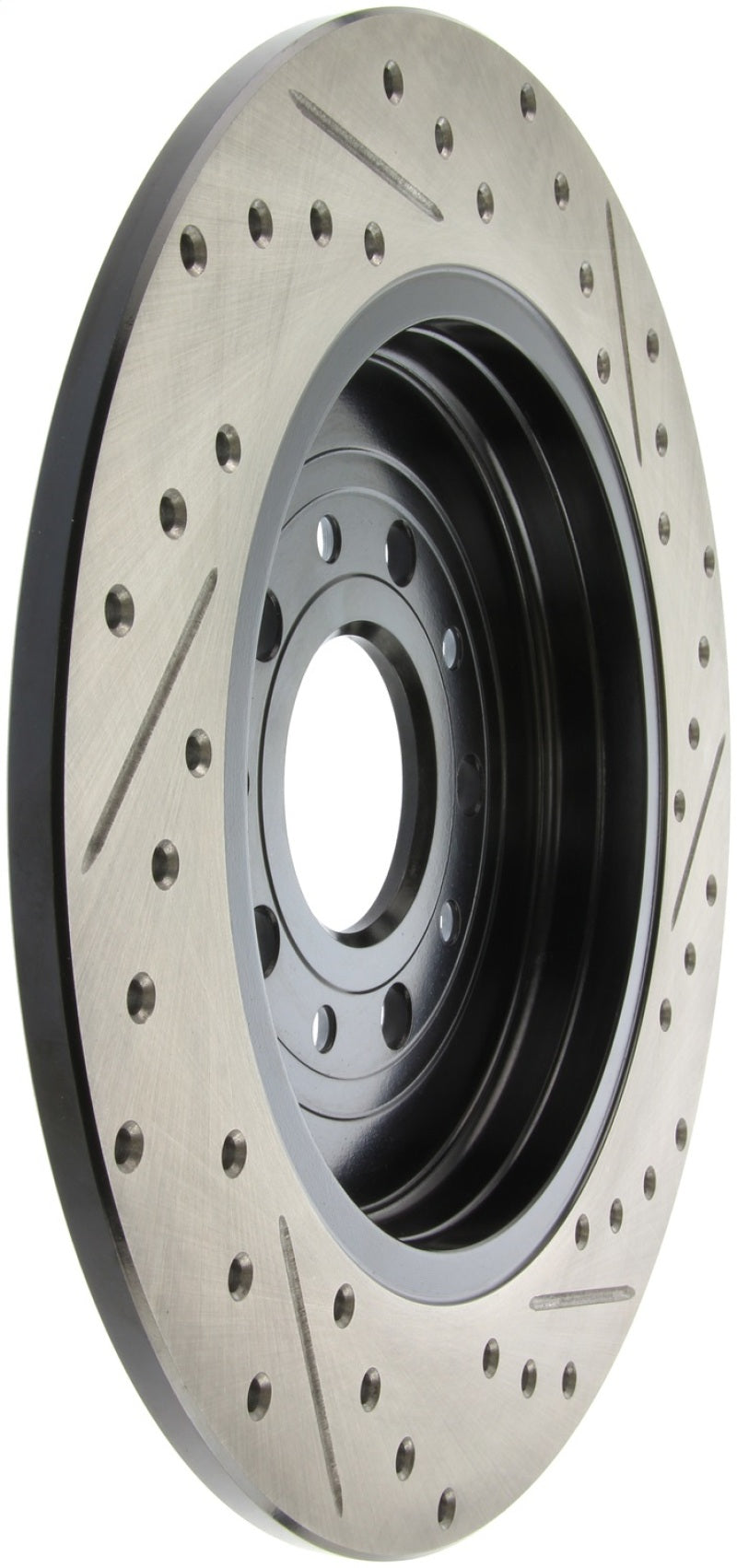 StopTech Drilled and Slotted Sport Rotors are 1-piece direct replacement brake discs for factory brake systems and stock calipers that look great behind your wheels – and offer significantly improved braking performance. The unique cross-drilling and slotting aids with heat and brake dust dispersal, prevents glazing of the pads, adds bite and improves wet and dry braking performance. Built to last, the black e-coating provides protection from corrosion and the high carbon metallurgy (in most applications) offers quieter operation, better crack resistance and increased performance.