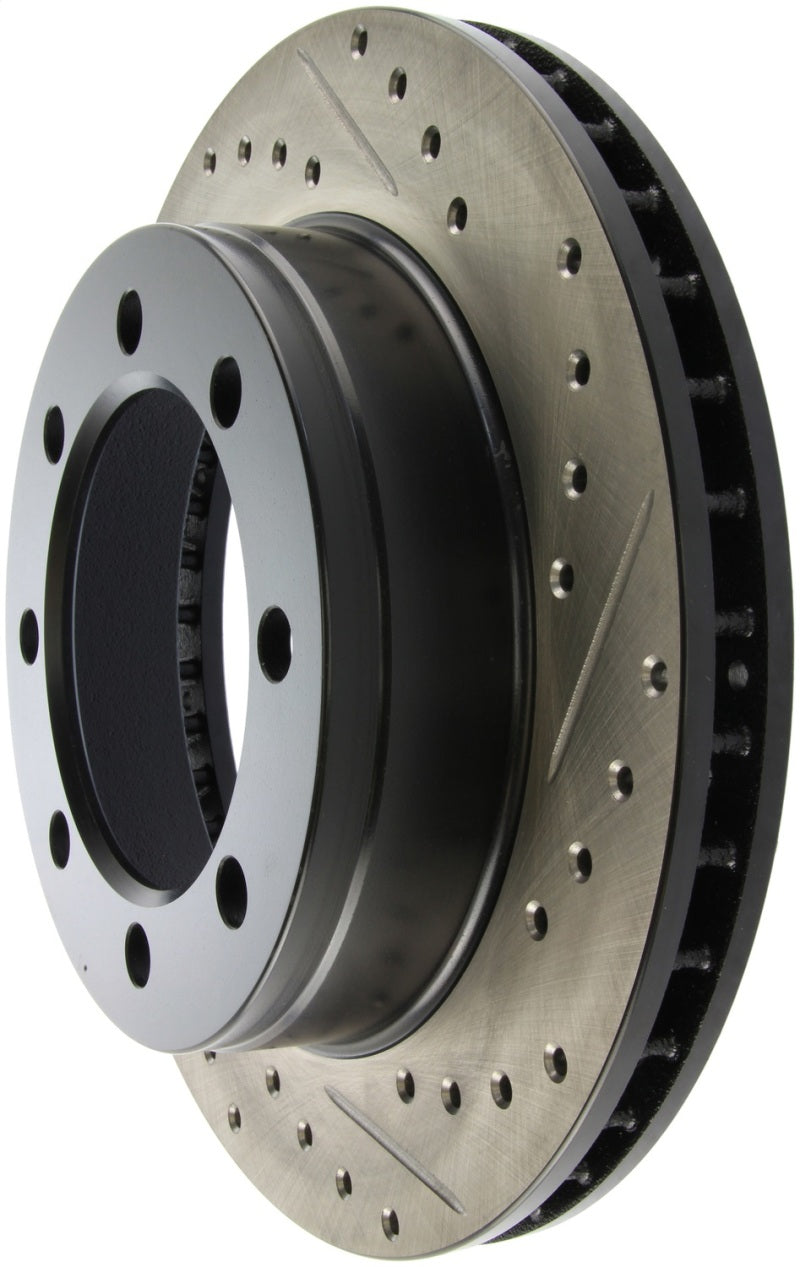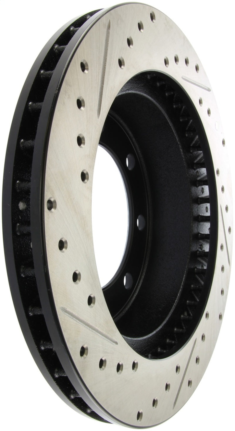 StopTech Drilled and Slotted Sport Rotors are 1-piece direct replacement brake discs for factory brake systems and stock calipers that look great behind your wheels – and offer significantly improved braking performance. The unique cross-drilling and slotting aids with heat and brake dust dispersal, prevents glazing of the pads, adds bite and improves wet and dry braking performance. Built to last, the black e-coating provides protection from corrosion and the high carbon metallurgy (in most applications) offers quieter operation, better crack resistance and increased performance.