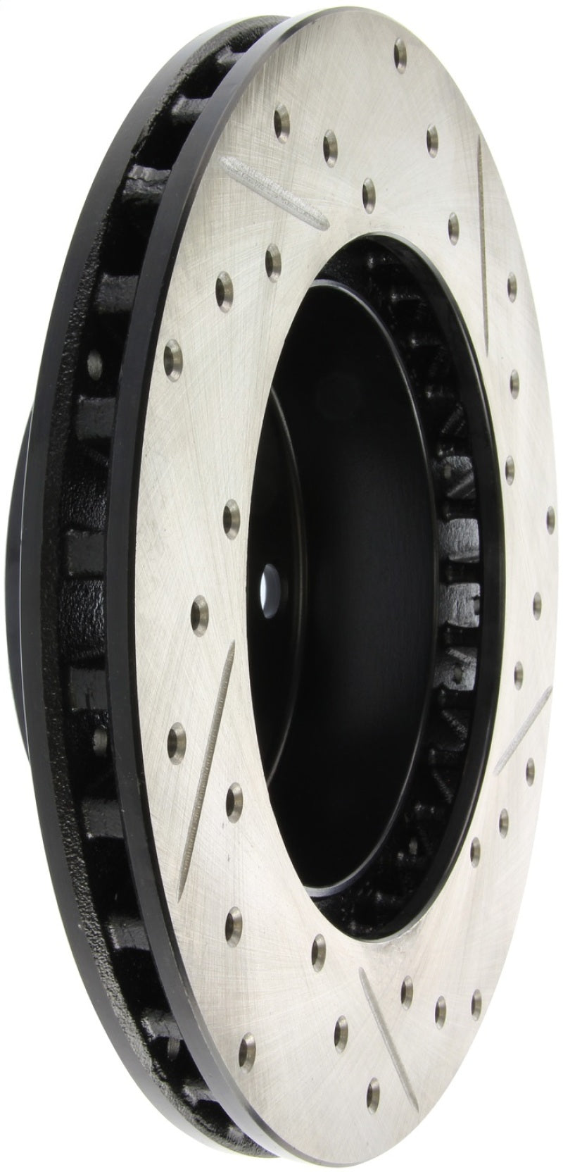 StopTech Drilled and Slotted Sport Rotors are 1-piece direct replacement brake discs for factory brake systems and stock calipers that look great behind your wheels – and offer significantly improved braking performance. The unique cross-drilling and slotting aids with heat and brake dust dispersal, prevents glazing of the pads, adds bite and improves wet and dry braking performance. Built to last, the black e-coating provides protection from corrosion and the high carbon metallurgy (in most applications) offers quieter operation, better crack resistance and increased performance.