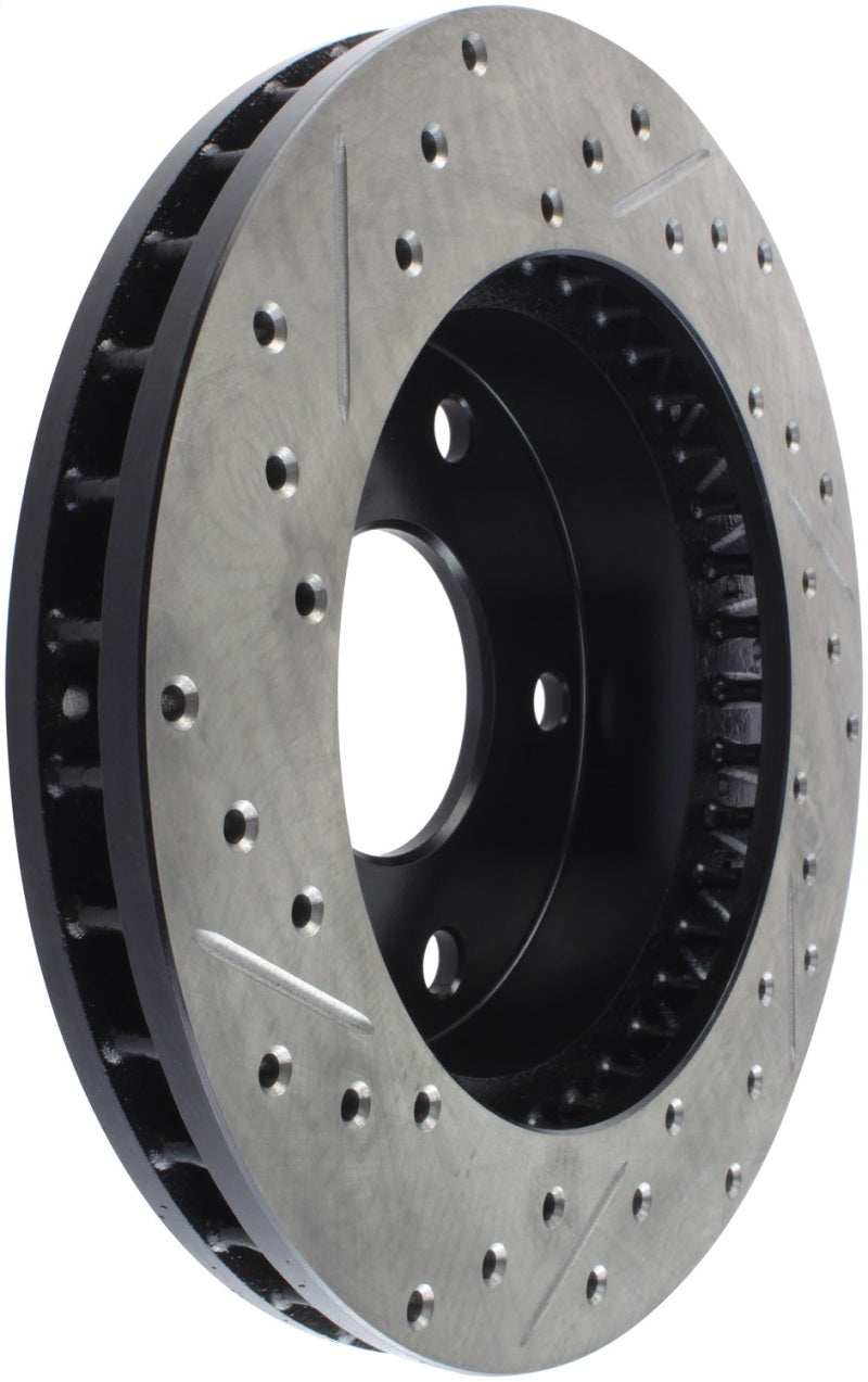 StopTech Drilled and Slotted Sport Rotors are 1-piece direct replacement brake discs for factory brake systems and stock calipers that look great behind your wheels – and offer significantly improved braking performance. The unique cross-drilling and slotting aids with heat and brake dust dispersal, prevents glazing of the pads, adds bite and improves wet and dry braking performance. Built to last, the black e-coating provides protection from corrosion and the high carbon metallurgy (in most applications) offers quieter operation, better crack resistance and increased performance.