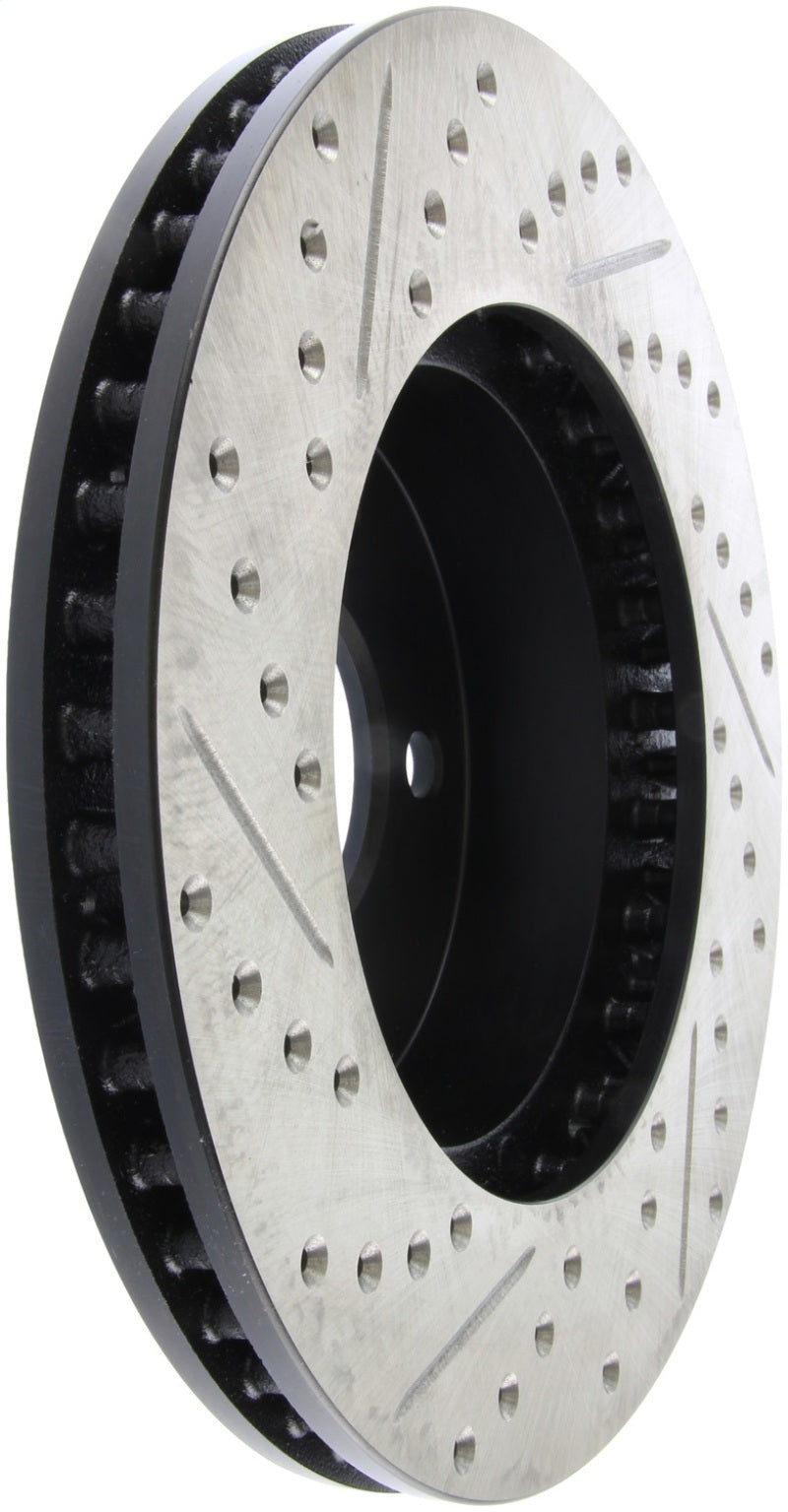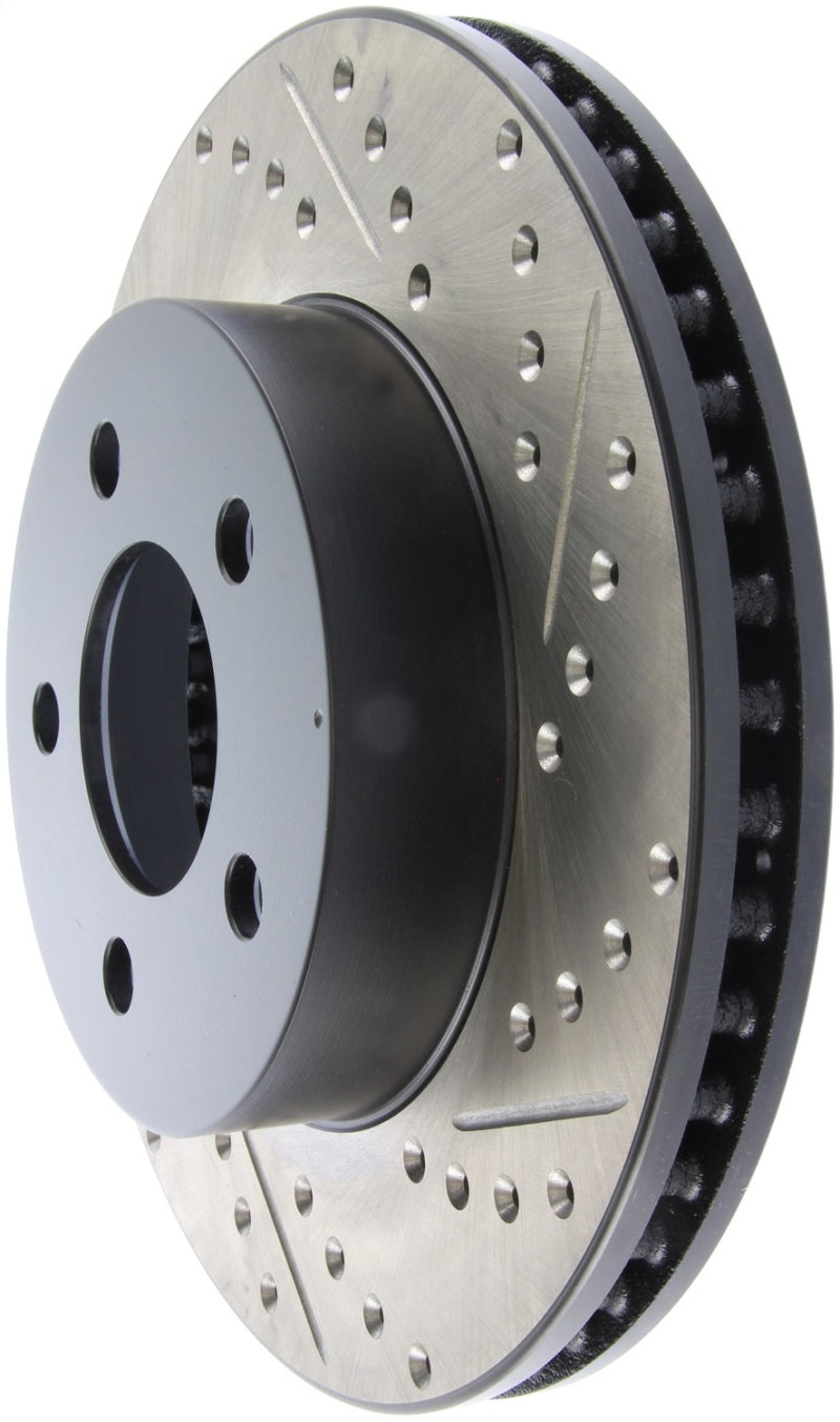 StopTech Drilled and Slotted Sport Rotors are 1-piece direct replacement brake discs for factory brake systems and stock calipers that look great behind your wheels – and offer significantly improved braking performance. The unique cross-drilling and slotting aids with heat and brake dust dispersal, prevents glazing of the pads, adds bite and improves wet and dry braking performance. Built to last, the black e-coating provides protection from corrosion and the high carbon metallurgy (in most applications) offers quieter operation, better crack resistance and increased performance.