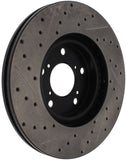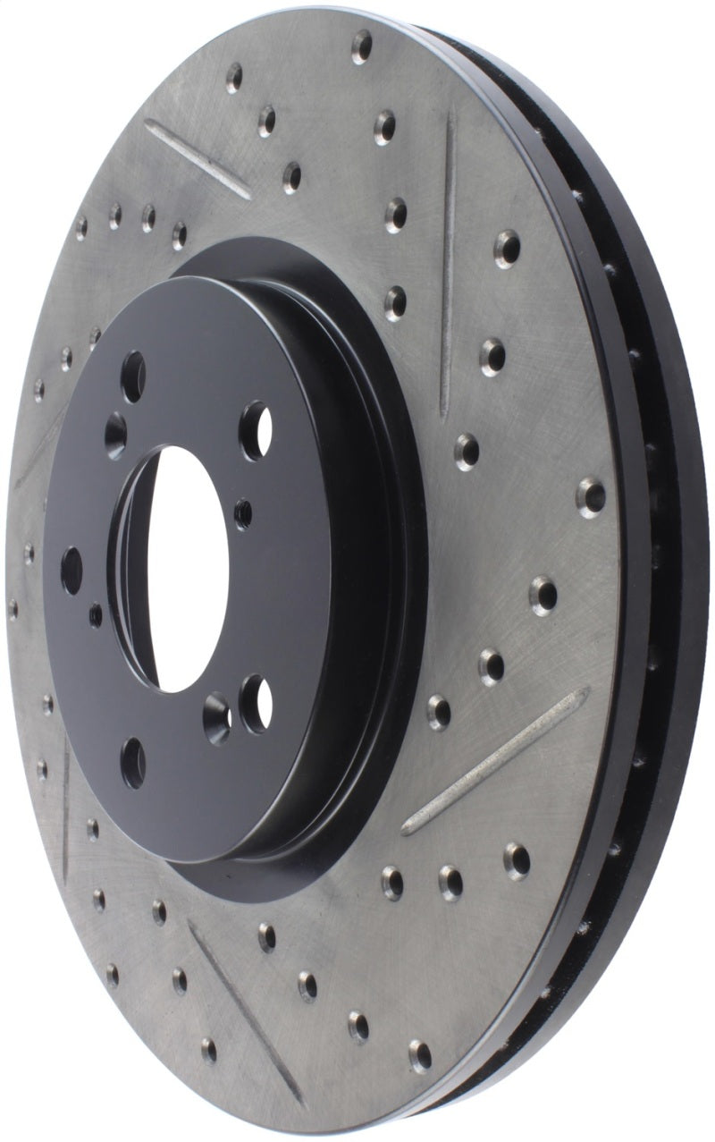 StopTech Drilled and Slotted Sport Rotors are 1-piece direct replacement brake discs for factory brake systems and stock calipers that look great behind your wheels – and offer significantly improved braking performance. The unique cross-drilling and slotting aids with heat and brake dust dispersal, prevents glazing of the pads, adds bite and improves wet and dry braking performance. Built to last, the black e-coating provides protection from corrosion and the high carbon metallurgy (in most applications) offers quieter operation, better crack resistance and increased performance.