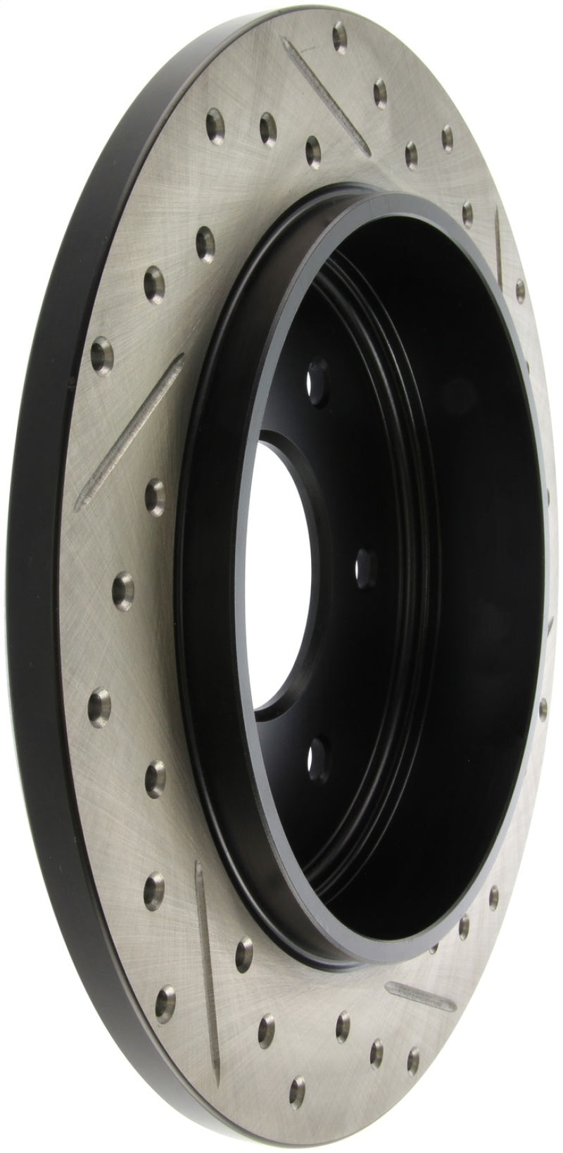 StopTech Drilled and Slotted Sport Rotors are 1-piece direct replacement brake discs for factory brake systems and stock calipers that look great behind your wheels – and offer significantly improved braking performance. The unique cross-drilling and slotting aids with heat and brake dust dispersal, prevents glazing of the pads, adds bite and improves wet and dry braking performance. Built to last, the black e-coating provides protection from corrosion and the high carbon metallurgy (in most applications) offers quieter operation, better crack resistance and increased performance.