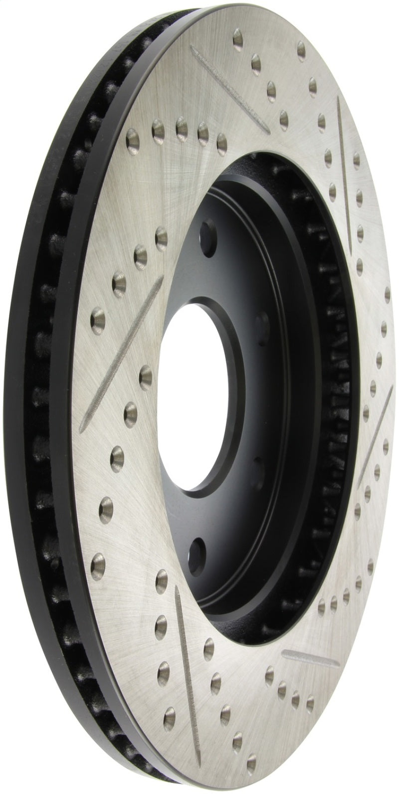 StopTech Drilled and Slotted Sport Rotors are 1-piece direct replacement brake discs for factory brake systems and stock calipers that look great behind your wheels – and offer significantly improved braking performance. The unique cross-drilling and slotting aids with heat and brake dust dispersal, prevents glazing of the pads, adds bite and improves wet and dry braking performance. Built to last, the black e-coating provides protection from corrosion and the high carbon metallurgy (in most applications) offers quieter operation, better crack resistance and increased performance.