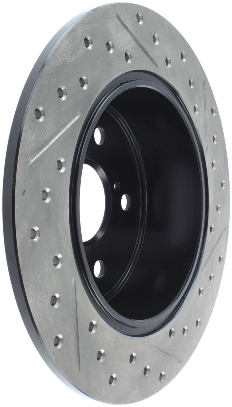 StopTech Drilled and Slotted Sport Rotors are 1-piece direct replacement brake discs for factory brake systems and stock calipers that look great behind your wheels – and offer significantly improved braking performance. The unique cross-drilling and slotting aids with heat and brake dust dispersal, prevents glazing of the pads, adds bite and improves wet and dry braking performance. Built to last, the black e-coating provides protection from corrosion and the high carbon metallurgy (in most applications) offers quieter operation, better crack resistance and increased performance.