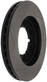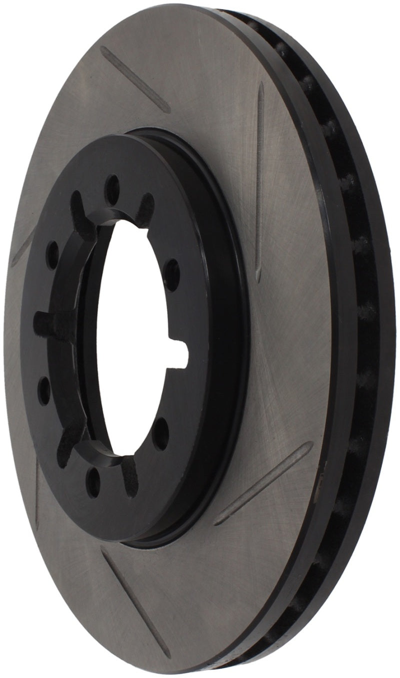 StopTech Slotted Sport Rotors are 1-piece direct replacement brake discs for factory brake systems and stock calipers that look great behind your wheels – and offer significantly improved braking performance. The unique slotting aids with heat and brake dust dispersal, prevents glazing of the pads, adds bite and improves wet and dry braking performance. Built to last, the black e-coating provides protection from corrosion and the high carbon metallurgy (in most applications) offers quieter operation, better crack resistance and increased performance.