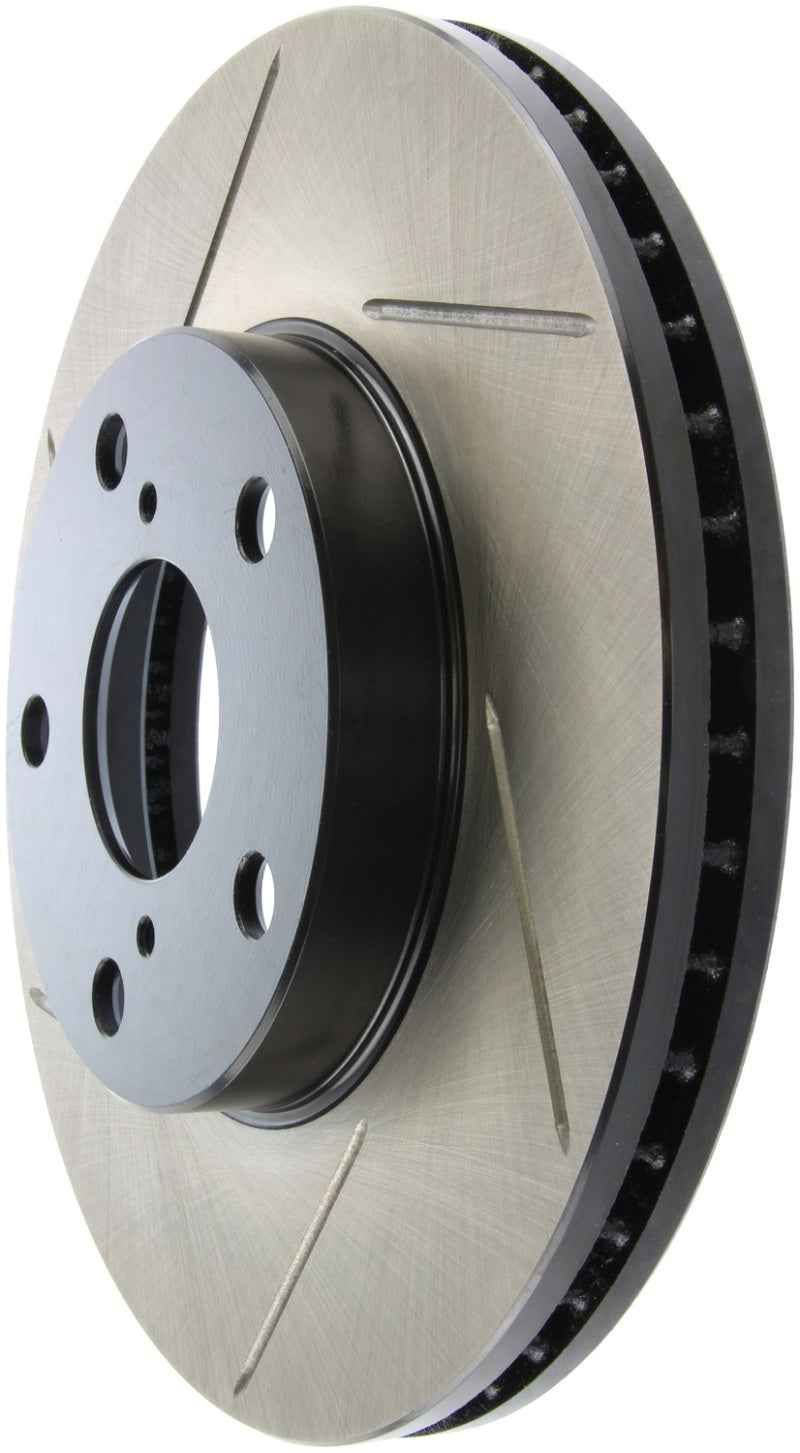 StopTech Slotted Sport Rotors are 1-piece direct replacement brake discs for factory brake systems and stock calipers that look great behind your wheels – and offer significantly improved braking performance. The unique slotting aids with heat and brake dust dispersal, prevents glazing of the pads, adds bite and improves wet and dry braking performance. Built to last, the black e-coating provides protection from corrosion and the high carbon metallurgy (in most applications) offers quieter operation, better crack resistance and increased performance.
