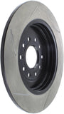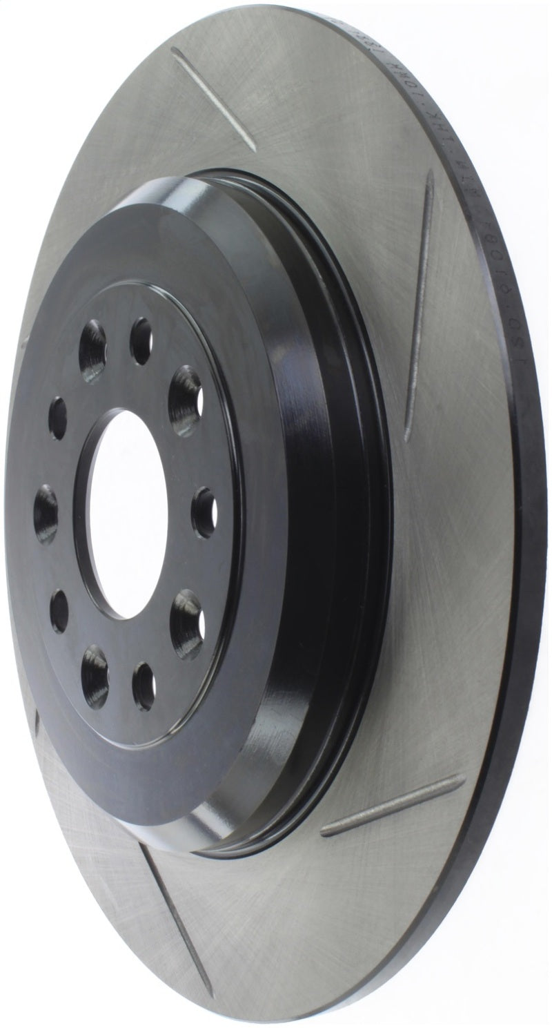 StopTech Slotted Sport Rotors are 1-piece direct replacement brake discs for factory brake systems and stock calipers that look great behind your wheels – and offer significantly improved braking performance. The unique slotting aids with heat and brake dust dispersal, prevents glazing of the pads, adds bite and improves wet and dry braking performance. Built to last, the black e-coating provides protection from corrosion and the high carbon metallurgy (in most applications) offers quieter operation, better crack resistance and increased performance.