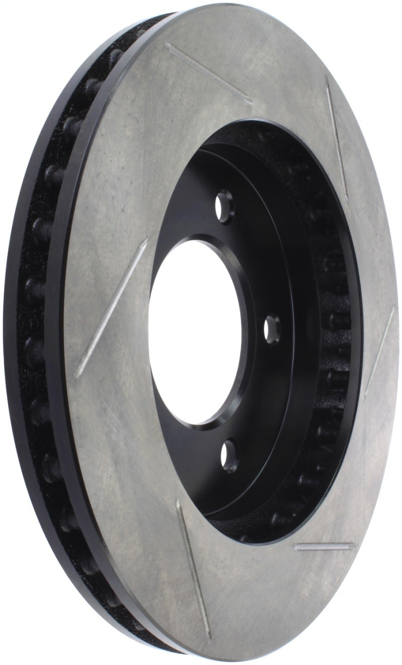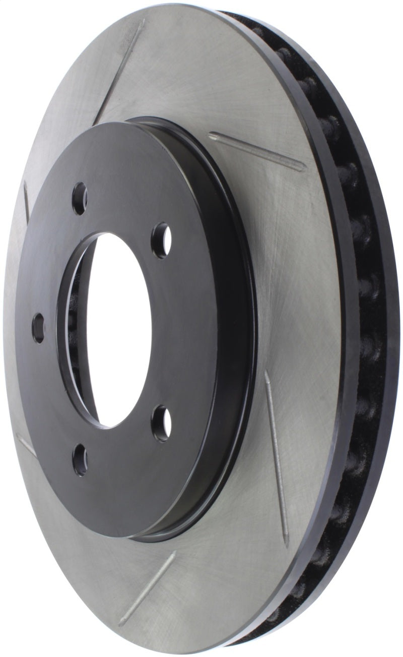 StopTech Slotted Sport Rotors are 1-piece direct replacement brake discs for factory brake systems and stock calipers that look great behind your wheels – and offer significantly improved braking performance. The unique slotting aids with heat and brake dust dispersal, prevents glazing of the pads, adds bite and improves wet and dry braking performance. Built to last, the black e-coating provides protection from corrosion and the high carbon metallurgy (in most applications) offers quieter operation, better crack resistance and increased performance.