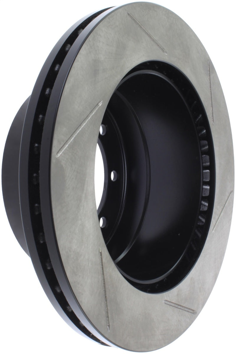 StopTech Slotted Sport Rotors are 1-piece direct replacement brake discs for factory brake systems and stock calipers that look great behind your wheels – and offer significantly improved braking performance. The unique slotting aids with heat and brake dust dispersal, prevents glazing of the pads, adds bite and improves wet and dry braking performance. Built to last, the black e-coating provides protection from corrosion and the high carbon metallurgy (in most applications) offers quieter operation, better crack resistance and increased performance.