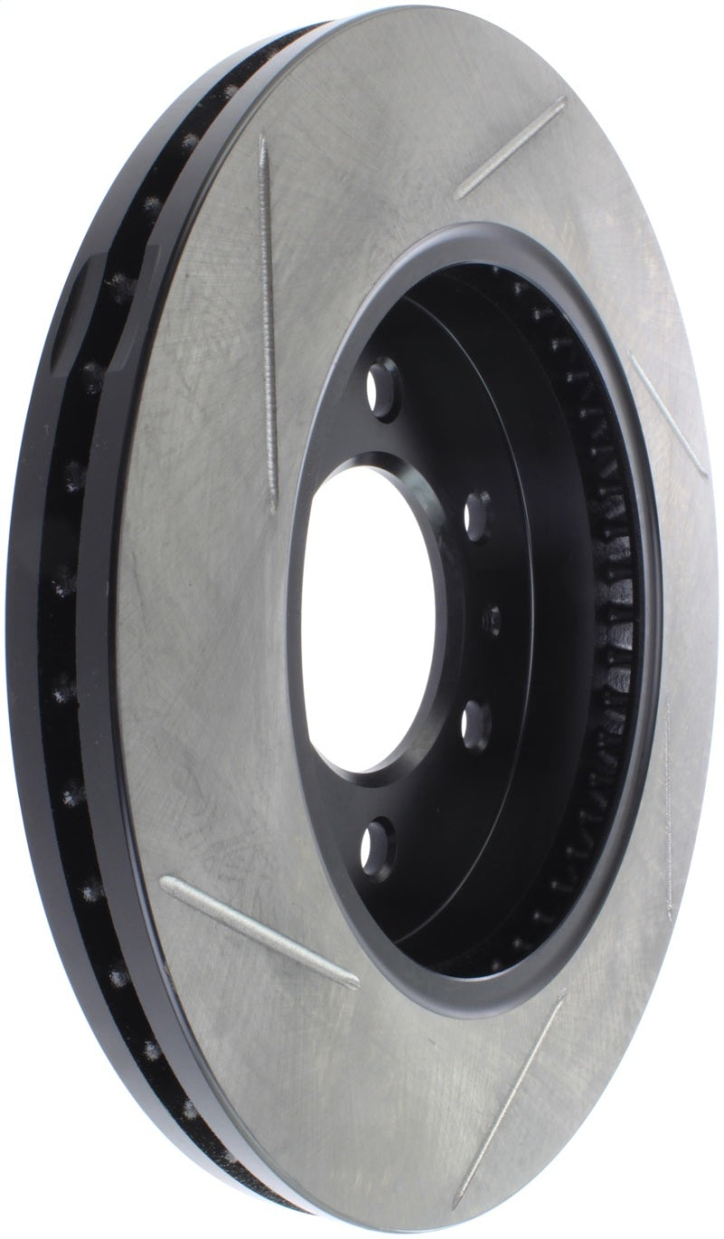 StopTech Slotted Sport Rotors are 1-piece direct replacement brake discs for factory brake systems and stock calipers that look great behind your wheels – and offer significantly improved braking performance. The unique slotting aids with heat and brake dust dispersal, prevents glazing of the pads, adds bite and improves wet and dry braking performance. Built to last, the black e-coating provides protection from corrosion and the high carbon metallurgy (in most applications) offers quieter operation, better crack resistance and increased performance.