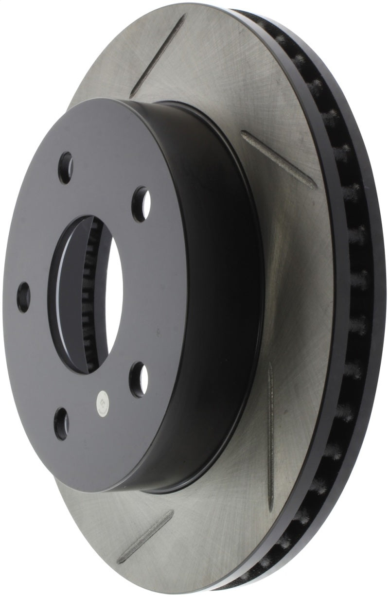StopTech Slotted Sport Rotors are 1-piece direct replacement brake discs for factory brake systems and stock calipers that look great behind your wheels – and offer significantly improved braking performance. The unique slotting aids with heat and brake dust dispersal, prevents glazing of the pads, adds bite and improves wet and dry braking performance. Built to last, the black e-coating provides protection from corrosion and the high carbon metallurgy (in most applications) offers quieter operation, better crack resistance and increased performance.