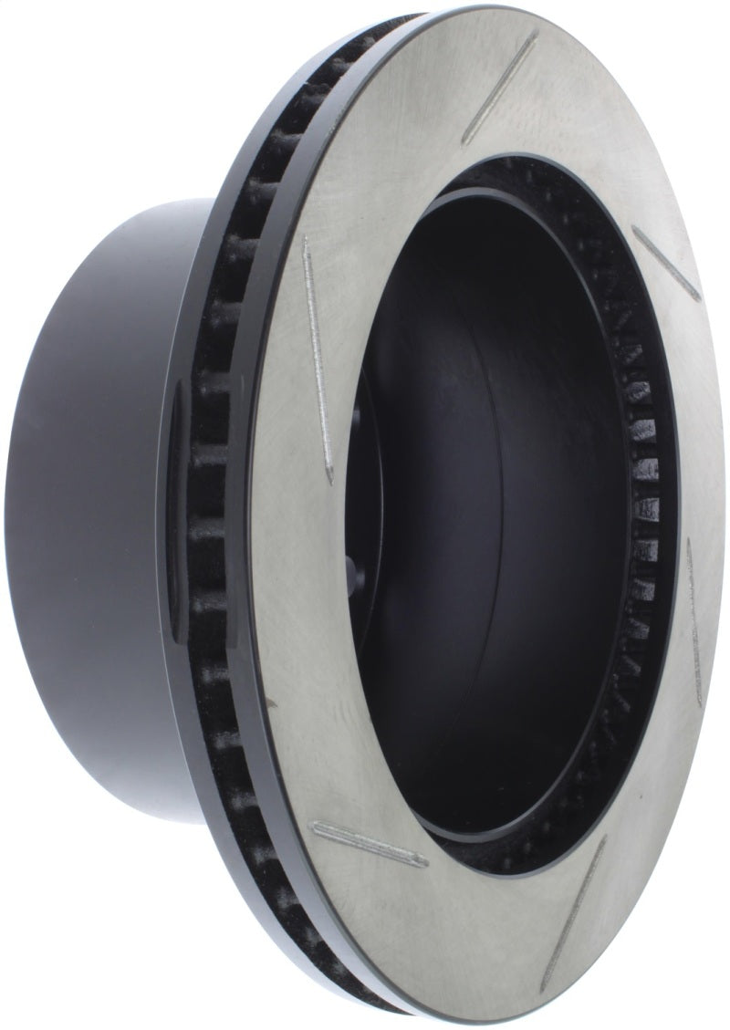 StopTech Slotted Sport Rotors are 1-piece direct replacement brake discs for factory brake systems and stock calipers that look great behind your wheels – and offer significantly improved braking performance. The unique slotting aids with heat and brake dust dispersal, prevents glazing of the pads, adds bite and improves wet and dry braking performance. Built to last, the black e-coating provides protection from corrosion and the high carbon metallurgy (in most applications) offers quieter operation, better crack resistance and increased performance.