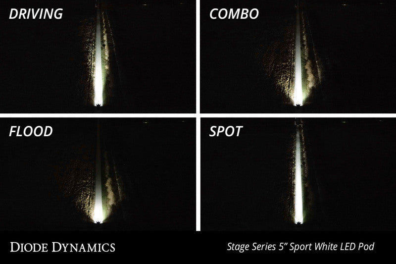Features Engineered TIR (total internal reflection) optics Selectable backlight color, with eight color options Built-in linking feature, build up to 50inch bar Torture-tested, heavy-duty construction Ultra-high intensity: shines almost mile away Assembled in USA Overview Introducing the SS5 LED Pod! Featuring the highest output intensity of any 5-inch LED pod on the market, these auxiliary lamps have been designed for maximum functionality, with patented technology and custom-engineered TIR optics, all in a durable package. Focused. Traditional optics like reflectors or simple lenses lose light internally and to glare, so not all of the light shines on target. Instead, the custom-engineered TIR optic in the SS5 collects all of the light from the LED, and directs it only where you need it, drastically reducing glare and improving total efficiency. Selectable Backlight. The Stage Series 5inch LED Pod features a selectable backlight with eight different color options, perfect for an extra styling accent, or for more visibility when you’re not using the main beam. Selecting your backlight color is easy - simply alternate the power on and off. There’s no complicated programming with a controller! The SS5's backlight fully illuminates the TIR optic, providing unique accent lighting that you won't find on other LED pods. Simple connections. All SS5 LED pods feature an integrated and waterproof DT type Deutsch-style connector on the back, and come with a 6-inch pigtail with bare leads. For installation, you can wire yourself, or select an optional Diode Dynamics wire harness.