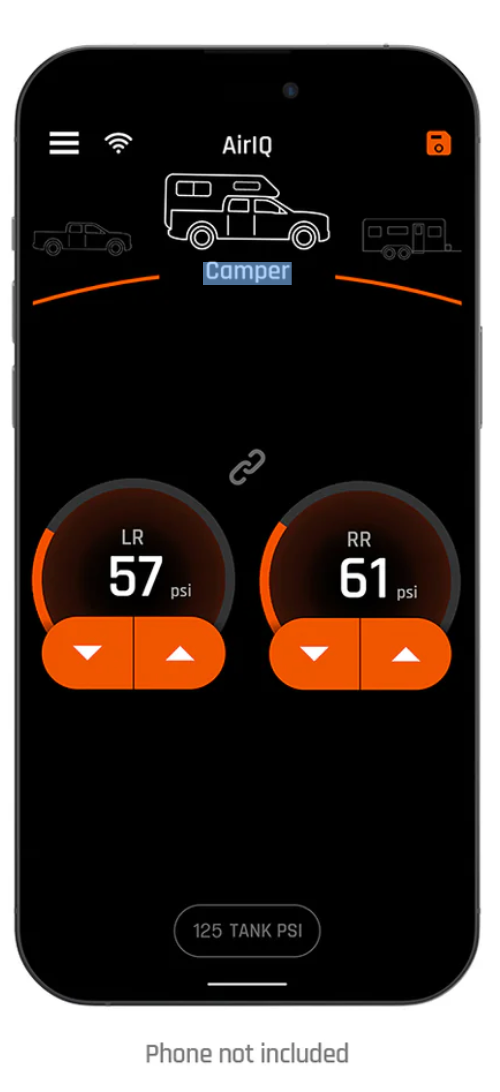 2-Channel AirIQ Bluetooth Management System for individual control of two air springs from the AirIQ App + LOGIQ 33% duty cycle, 150 psi compressor with 2.62 CFM @ 0 psi + plumbing kit and wiring + Easy Frame Mounting Brackets