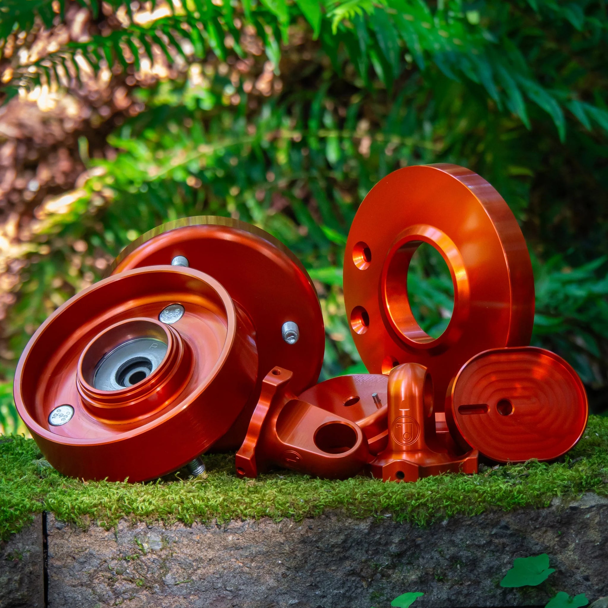 The kit includes our top hats, shock eyelets, bump stop spacers, and rear spring spacers, and all the hardware needed for installation as well as the tool to install bushings into the shock eyelets. All our parts are designed, tested, and made in the USA.